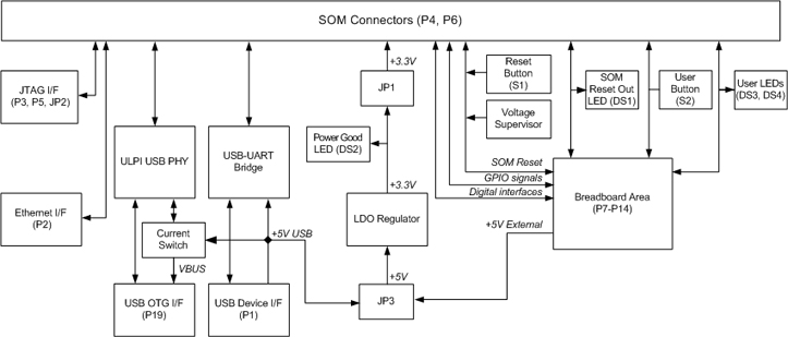 - Depending on the design, can provide necessary power supply voltages (+5 V, +3.3 V, +1.5 V for power-optimized SOM operation) from external sources through dedicated pads on the breadboard.