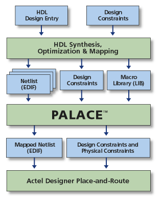 PALACE AE´Â ÇÁ·ÎÆ®¿£µå(Front-end)·Î´Â Actel µð¹ÙÀ̽º¸¦ Áö¿øÇÏ´Â ¸ðµç ÇÕ¼ºÅø(synthesis tool)ÀÇ EDIF netlist¿Í ÀÎÅÍÆäÀ̽º¸¦ ÀÌ·ê ¼ö ÀÖÀ¸¸ç ¹é¿£µå(Back-end)·Î´Â ÀÚµ¿¹èÄ¡¹è¼±¿¬°á(Placement and Route) ¹× ŸÀÌ¹Ö ºÐ¼®À» À§ÇÑ ActelÀÇ Designer ¼ÒÇÁÆ®¿þ¾î·Î ¿¬°áµÇ¾î Áø´Ù. ±âÁ¸ÀÇ HDL Synthesis¿¡¼ ActelÀÇ designer·Î °¡´Â ´Ü°è¿¡ Çѹø ´õ ·ÎÁ÷ ¹× ¼º´ÉÇâ»óÀ» À§ÇÏ¿© »ç¿ëÇÏ°Ô µÈ´Ù.