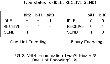 ¿°ÅÇüÀ» ÀÌ¿ëÇÏ¸é »ç¿ëÀÚ´Â ¾ðÀçµçÁö ÀÚ·áÇüÀÇ Á¤Àǰ¡ °¡´ÉÇÏ´Ù. ¶ÇÇÑ ¿°ÅÇüÀ¸·Î Á¤ÀÇµÈ °æ¿ì ÀÎ ÄÚµù(encoding) ¹æ¹ýÀ» ÁöÁ¤ÇÒ ¼ö ÀÖ´Ù. ÀÎ ÄÚµù ¹æ¹ýÀ¸·Î´Â 2Áø Äڵ忡 ÀÇÇÑ ¹æ¹ý(binary)°ú One-Hot EncodingÀÌ ÀÖ´Ù. One-Hot encoding ¹æ¹ýÀº À¯ÇÑ»óÅ ¸Ó½Å(FSM : Finite State Machine)¿¡¼ »óŸ¦ ³ªÅ¸³»´Â °æ¿ì¿¡ ¸¹ÀÌ ÀÌ¿ëµÇ´Â ¹æ¹ýÀÌ´Ù. ´ÙÀ½°ú °°Àº ¿¹¸¦ »ìÆìº¸ÀÚ.