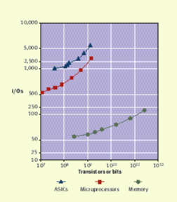 Rent's rule, originally proposed in 1971, indicates a direct relationship between gates, or rather transistors, and I/O. The SIA has extended it in its 1997 National Technology Roadmap for Semiconductors for proposed process technologies through the year 2012, as shown here. |