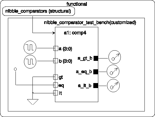 a1: comp4 PORT MAP (a, b, gnd, vdd, gnd, gtr, eql, lss);