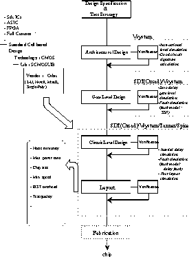We have presented methodologies for the design and verification of VLSI circuits. VHDL based tools are used in this process. Where needed programs for linking VHDL based tools and other VLSI tools have been developed. The paper has presented the use and implementation of a BIST architecture. This architecture not only is useful for final testing of the circuit, but it is also used for verifying design steps leading to the VLSI implementation of a relatively large design.
