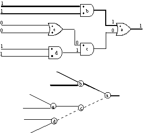 In the original critical path tracing method [1], primary input values are propagated to all circuit lines. The circuit is traced from output to input for identifying critical lines in a manner similar to what was described in the previous section. In the process of this tracing, when a fanout is encountered, a simulation phase will determine if the effect of changing the value of a fanout stem will be marked as critical. In order to reduce the size of the part of the circuit that is simulated, a partitioning of the circuit is done to simulate only up to the point whose effect on the output is known. From the above discussion it is clear that critical path tracing by this method requires much forward simulation and backward propagation in an iterative fashion. In addition, partitioning of the circuit into isolated parts with inputs influenced by fanout stem and outputs influencing the primary output is a time consuming process. Above all, the case mentioned before, in which a fanout stem can be critical even if none of its branches are critical, cannot be handled by the standard CPT method. This is because, the method requires a critical path through branches to reach to a fanout.