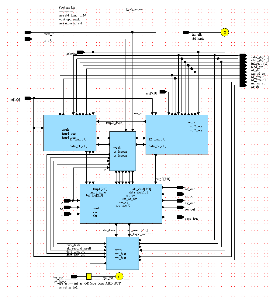 build -- script to build the components of system latch373.vhd -- 8 D-LATCHES max232.vhd -- Nothing yet mc8051.vhd -- The model of the 8051 MicroController (requires uart.vhd) nvsram.vhd -- SRAM that will only read from hex files pack8051.vhd -- Supporting package for mc8051.vhd quickhdl.ini -- Link to ini file system.vhd -- Toplevel VHDL Structural model of a system containing -- 8051, ram, 373 latches, and clock process. tb.vhd -- Old Testbench of mc8051.vhd using pwmodulator