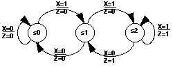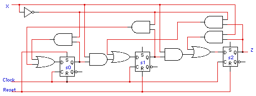 ENTITY FSM port ( X : in bit; clock, reset : in bit; Z : out bit ) is end FSM; ARCHITECTURE enum OF FSM is type State is ( s0, s1, s2 ); signal current_state, next_state : State; begin Ck_reg: process ( clock ) begin if (reset = '1') then current_state <= s0; elsif (clock'event and clock='1' and clock'last_value = '0') then current_state <= next_state; end if; end process; Next_logic: process (X, current_state) begin case current_state is when s0 => if X='1' then next_state <= s1 else next_state <= s0; when s1 => if X='1' then next_state <= s2 else next_state <= s0; when s2 => if X='1' then next_state <= s2 else next_state <= s1; end case; end process; Output_logic: process ( current_state ) -- Note that the Z output is function only of the current_state. begin case current_state is when s0 | s1 => Z <= '0'; when s2 => Z <= '1'; end case; end process; end enum;VI.b. Draw a schematic (using D flipflops) similar to the circuit that either Synopsys or Autologic should produce from such a description. Assume a "one hot" encoding of the states.