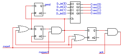 ARCHITECTURE a OF b IS SIGNAL request, send, ack : boolean; SIGNAL Data_in, Cvec : std_logic_vector (0 to 3); BEGIN PROCESS BEGIN send <= false; WAIT UNTIL request; send <= true; Cvec <= Data_in; WAIT UNTIL ack; END PROCESS; END a;
