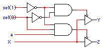 b. IF sel = "00" THEN Y <= X; ELSE Y <= 'Z'; END IF; IF sel = "01" and a THEN Z <= X; ELSE Z <= Z'; END IF;
