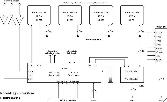The goal of the Recording Subsystem (Bullwinkle) card is to accumulate incoming data in buffer RAM and periodically save it to disk. The speed of the buffer RAM circuitry is critical because 64 bits of data come in from the ribbon cables as often as every 80 ns (assuming 25 MHz SUT speed). By using 70 ns SRAM chips and a 64 bit wide data pipeline, we should be able to achieve this goal.