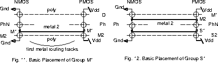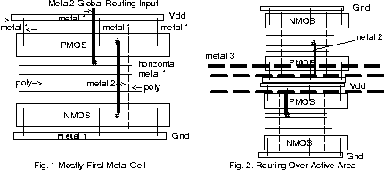 While using place and route CAD tools with only two layers of metal, the rows of standard cells border routing channels above and below the rows. Horizontal global routing is implemented in first metal while vertical routing into and out of the cells is implemented with second metal. When using three layers of metal, the third metal is used for the horizontal routing interconnections (parallel to diffused regions) while second metal is used as before. With three layers, it is important to vertically mirror every other row in order to place similar supplies next to one another on adjacent rows. With the third metal scheme, the conventional place and route is achieved as before, but with the global parallel wiring in third metal. After routing, however, the adjacent rows are compacted, thus shoving the active regions under the routing channel. Conceivably, the supplies can be merged, as shown in figure 2. One observes the need to localize the second metal within the cell to the central region in order to facilitate compaction.