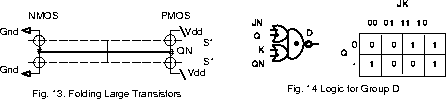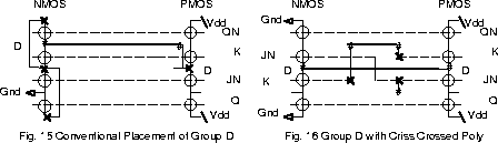 One very desirable attribute of this layout is the placement of the source nodes at the outside, which supports sharing with neighbors. The dual network has a length along the diffusion of 40 lambda (tesselation box width). With sharing of the supplies, the second version has a length of 26 lambda. In addition, four metal 1 tracks, corresponding to JN, K, D, and Q/QN, are required. Referring back to the first pass" group placement, the D group has signals S1 and S2, passing through; hence, six M1 tracks are required. Placing the D group on the bottom is required, as anticipated.