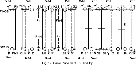 However, this version requires more area and is slower than for a modified version implemented with a parallel NMOS network of series devices. From the Kmap the output D should be zero for D = Q*K +QN*JN. This layout does not have the shorting bar" in the NMOS network that the previous layout contains, nor does it have the extra junction contacts (and capacitance). However, the poly interconnect is no longer straight across as in the original Phillips style of layout. If one desires to reduce set-up time (instead of toggle frequency), then the JN and K inputs should be next to the D output. Arranging Q and QN as straight across leaves JN and K crossing as shown. The straight metal 2 interconnects prevent needless blocking of global interconnect. In addition, the metal 2 tracks align to the junction contacts, at least before compaction, which facilitates exit routing and forces the input routing off of the poly gates.