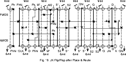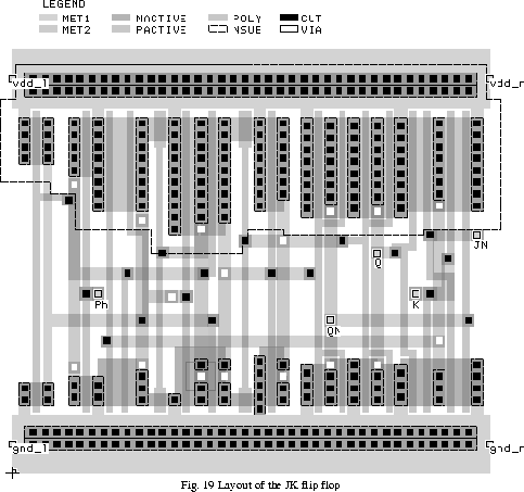 The final layout of the jk flip flop is shown in figure 19. This layout is scalable from the MOSIS 2um to the MOSIS 0.8um technology, while making full use of the metal3 routing layer available with the 0.8um technology. However, the layout does not fully exploit the refractory silicides available with the MOSIS 0.8um technology. The sheet resistance of the doped polysilicon and the junctions are 20-40 W/V and 80-100 W/V respectively, a limitation in their use for long interconnection