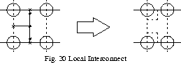 The local interconnect allows a direct connection between the drains of the transistors to the polysilicon gate. This extra layer can be utilized to interconnect drain outputs to gate inputs, without the use of short metal stubs as shown in figure 20. The figure shows how the use of local interconnect, with buried contacts in CMOS eliminates a horizontal metal routing channel and a vertical metal2 interconnect. Since the gate can directly connect to the drain, the role of first metal as a connection means changes significantly. Due to advancements in the technology, at some point the special local interconnect layers, e.g., refractory metal etc., are going to be available to the MOSIS community.