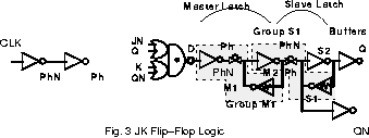 The logic for the example came from the MOSIS. The cell is traditional CMOS compatible with the Phillips style of layout. The F/F is a basic D type with the extra JK gate to create the D signal. The feedback is achieved with high resistance inverters in both the master and the slave latches. Both slave nodes are buffered for drive while the input clock uses buffers to drive the pair of transmission gates.