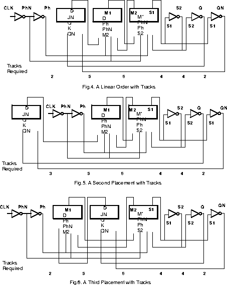 One desirable property is the direct feed of an output to a neighbor, particularly when there is only a fan-out of one. The two clock outputs, Ph and PhN, feed to both the M1 and S1 groups and pass through the D group. Further, the D group has the two inputs Q and QN without using the clocks. Clearly, the D group is out of place. Consider exchanging the positions of the clock and D groups (Fig. 5). While the tracks required at the bottom of D dropped from 5 to 3, it really accomplished nothing in the most dense locations (6). Consider the notion of exchanging D and M1 in the original placement. The M1 cross-section (at the bottom of M1 unless otherwise indicated) has dropped from 6 to 5 tracks. The D group has a single connection to the M1 group but two to the output buffers.