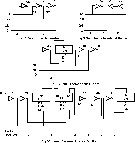 As the D group moves away from the M1 group and towards the output buffers, the remaining cros-section has one less track. Q and QN tracks are removed, but the D track is added. Clearly, the D group should be moved lower until it is next to the output buffers. But where should the output buffers be? Exchanging the two buffers themselves only swaps the S1 and S2 extensions" which has only a slight advantage in performance by minimizing the interconnect loading on the higher output impedance S1. However, if the QN buffer is placed next to the S1 group, S1 only needs to extend to the S2 inverter (figure 7).