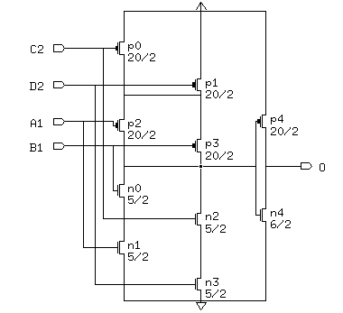 -------------------------------------------- Name X_loc Y_loc Capacitance (fF) lambda lambda 2U 1.2U 0.8U -------------------------------------------- A1 54.25 28 66.2 31.9 26.2 B1 33 29 62.4 30.6 25.2 C2 20 22 58.3 28.4 24.3 D2 4.95 23.9 66.7 31.9 26.5 O 72 25.5 - - - --------------------------------------------