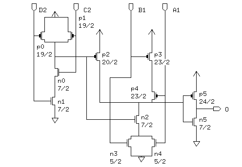 -------------------------------------------- Name X_loc Y_loc Capacitance (fF) lambda lambda 2U 1.2U 0.8U -------------------------------------------- A1 50 18 65.0 32.3 27.4 B1 63 20.05 69.5 34.4 28.8 C2 24.5 31 62.1 30.8 25.8 D2 7 28 66.7 32.5 27.2 O 82.45 24 - - - --------------------------------------------