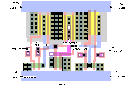 -------------------------------------------- Name X_loc Y_loc Capacitance (fF) lambda lambda 2U 1.2U 0.8U -------------------------------------------- A1 6.5 23.5 66.1 31.8 22.7 B1 16 23.5 61.6 30.2 21.9 C2 58 21 68.8 33.9 25.1 D2 77 21 67.2 33.3 24.5 O 46 25.5 - - - --------------------------------------------