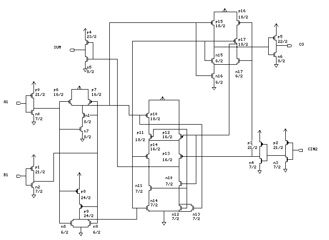 -------------------------------------------- Name X_loc Y_loc Capacitance (fF) lambda lambda 2U 1.2U 0.8U -------------------------------------------- A1 13 30.5 68.5 34.2 28.7 B1 75 35 56.9 28.0 25.3 CIN2 258 27 69.5 34.8 29.3 CO 234.5 28 - - - SUM 167 31.5 - - - --------------------------------------------