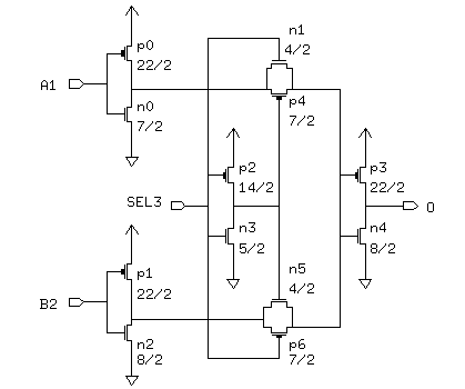 -------------------------------------------- Name X_loc Y_loc Capacitance (fF) lambda lambda 2U 1.2U 0.8U -------------------------------------------- A1 11 32 70.0 35.1 30.1 B2 80 21 74.0 37.1 31.5 O 94 29 - - - SEL3 20 32 63.6 28.7 27.0 --------------------------------------------