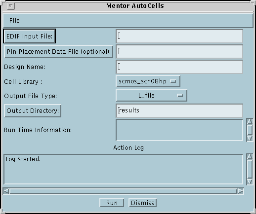 Left clicking on the Input File button will pop up a file dialog box thru which you can specify your input file. Alternatively, you can use the typein field to specify the pathname to your file. The service only EDIF input files (and has only been tested with EDIF files from the Synopsys synthesis tool). The EDIF file needs to be a flattened netlist of cells from one of the MSU standard cell libraries.
