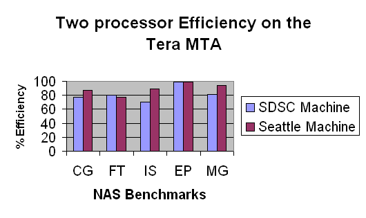 Figure 3 shows the results of running our most highly-tuned versions of each NAS 2.3 kernel benchmark on one and two processors of the MTA. "Parallel Efficiency" is defined in Section 5. Results are reported for the MTA at San Diego and the MTA belonging to Tera in Seattle. To enable the benchmarks to run on two processors, it was only necessary, in all cases, to recompile the unmodified source file with the appropriate compiler flags. All runs are for Class A of the benchmarks, the smallest supercomputer class size.