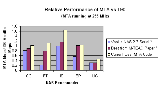 In [1] we extrapolated the performance of a one processor MTA prototype, which ran at 145 MHz, to 333 MHz and compared that performance to a single processor of the T90. In [3] we updated these results and present one- and two-processor results on three full application codes. Subsequently, we have made further improvements to the NAS kernel benchmarks. The performance of the previous and current versions are shown in table and graphical form below.