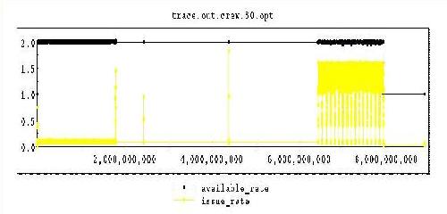 The horizontal axis represents runtime in clock cycles ("tics"). The vertical axis represents available issue slots and the yellow curve shows the utilization of these issue slots by CG. The 1.0 level would represent full utilization of the available issue slots on one processor. The 2.0 level represents full utilization of two processors. As can be seen, CG runs almost purely serial at first. This is all setup which is untimed in the benchmark. We made no effort to parallelize the untimed portion. The yellow block at the right hand end of the graph shows the execution "going parallel"; this is the timed portion of the benchmark. CG is using about 1.7 of the available issue slots on two processors. Interestingly, the one processor version uses about 95%. The difference is largely due to the imperfect network.