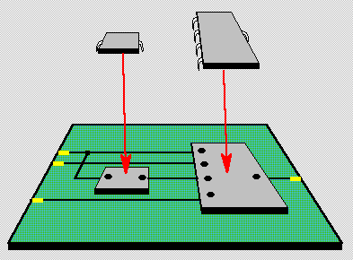 The concept of port mapping is little more than soldering the chip socket pins into the holes of the PCB. Thus in the case of our inverter, the F output pin of the INV chip is plugged into the F pin of the INV socket. The F pin of the INV socket is soldered to a PCB trace called SELB.