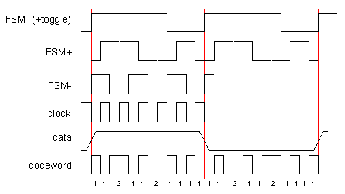 There are a variety of solutions to implementing this increase in data rate. One solution is to use a shift register running at 12x the original data rate, but this requires a large number of registers. The most compact solution that we found was to implement a 12-state state machine. The key to minimizing the hardware is simply the ability to recognise patterns in the state vector registers output sequence (remember that patterns analysis was also used to minimize the hardware in the scaler Model).