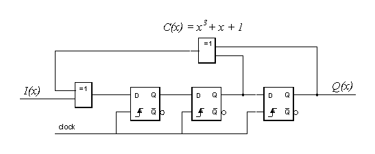 Equation 2. Mathematical Relationship of Polynomials where C(x) is the transfer function of the modulo-2 division... Figure 1. Dataflow Relationship of Polynomials ... and R(x) is the remainder. R(x)/C(x) is not the remainder, it's the fractional part of the division. The remainder R(x) is resident in the modulo-2 division circuit at the point in time at which the quotient has been output (remember were working with serial data here). A little algebra yields, I(x) = C(x)Q(x) + R(x) Equation 3. Calculation of I(x) C(x) is often known as the characteristic polynomial. So, we can multiply the characteristic polynomial of our modulo-2 division circuit by the quotient, add the remainder and we should (should!) create the original input polynomial. We can use this approach to show that the modulo-2 division circuit works correctly. So to summarise, in hardware terms, I(x) is the binary data stream to our modulo-2 division circuit, Q(x) is the binary data stream produced at the output of our modulo-2 division circuit and R(x) is the remainder left behind in our modulo-2 division circuit. And what is this modulo-2 division circuit? Yes, it's the SISR! The characteristic polynomial of the SISR is C(x). Thus we should be able to simulate the SISR with the output from the circuit under test, this is I(x). After 2n-1 cycles, the SISR should contain the signature, this is R(x). The output of the SISR produced during the 2n-1 cycles is Q(x). The characteristic polynomial of the SISR itself is C(x). Note that for the first few cycles, the first few bits output from the SISR will be the original state of the SISR, these are not part of Q(x). It is customary to set the initial SISR state to all zeroes. Independently, using equation 2, we must divide C(x) into I(x) (using long division) and record Q(x) and R(x). One is not expected to do this by hand, various software packages can be used to obtain the results. You could even create a separate VHDL testbench to generate Q(x) and R(x), just so long as you take a completely different approach from that used in the SISR simulation you could create a modulo-2 long_division function to mimic the SISR behaviour. Now, to present the principles of deriving the known good signature, let's see how it's done with a much smaller example than our original 10-bit SISR. Otherwise we're going to have to express I(x) as a 1024-bit polynomial for this 10-bit design and derive the signature, which just takes too long to explain. Figure 2. Hardware Implementation of Polynomials So for a 3-bit LFSR sequence, from the output of a simple faulty circuit, the polynomial is:
