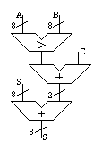 Oh, jolly good! These are proper synthesis tools aren't they? Well, er, no, actually. You can see that in this architecture there are three arithmetic path delays from a, b to s. In the multiplexer-oriented structure, there are only two arithmetic path delays (the mux delays are often insignificant compared to arithmetic unit delays). And once again, you’re stuck with the initial architecture created by the RTL synthesis tool.