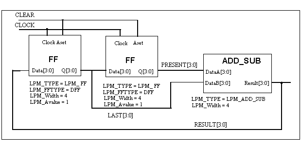 map statement. LPM_FF u1 (.data(result), .q(last), .clock(clock),.aset(clear)); All the used LPM properties values are defined in generic map construct of Verilog.