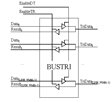 Note1: When both control ports (EnableDT and EnableTR) are inactive (LOW) the Result port is high impedance, and the TriData port will take its value from the attached net (i.e. it is not driven by the LPM_Bustri).