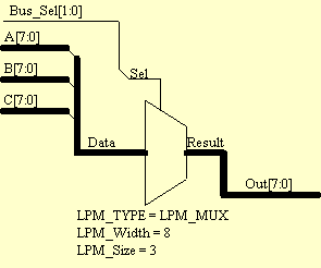 Supposing that bus A becomes Data2Xi, bus B becomes Data1Xi, and bus C becomes Data0Xi, the function performed by the LPM_MUX gate in this case is: