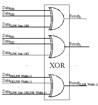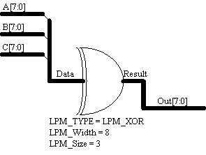 Suppose the designers have three 8-bit buses and they want to XOR the corresponding bits of the three buses. This is done using an LPM_XOR with an LPM_Width of 8 and an LPM_Size of three. The LPM_Width of eight indicates that there are eight XOR gates, and the LPM_Size of three indicates that each XOR gate has three inputs.