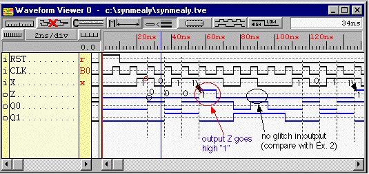 Notice that the output Z is valid after the positive clock edge (in response to the input value just before the positive clock edge). The output asserts at the positive clock edge when the input has gone through the sequence "1011". Notice also that the glitch which was present in the non-synchronous Mealy machine is gone.