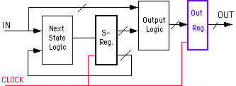 This timing in a synchronous Mealy machine is thus less critical than in a non-synchronous machine. The price one pays for this, is additional hardware. Making the output synchronous requires additional flip-flops as is illustrated by the blue box (Output Registers) in the generic block diagram of a synchronous Mealy machine in Figure 3.