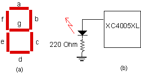 The XS40 board contains one 7-segment LED display whose elements are connected to one of the pins of the FPGA. The pin I/O connections of the display to the FPGA are shown in the table below. A 220W resistor is placed between the LED element and the ground to limit the current needed from the FPGA output. A schematic diagram of the LED circuit used in the display and the numbering of the elements is shown in Figure 3. The LEDs are active-high, which implies that they will light up when a logic "1" is applied to their terminal.