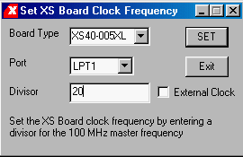The default setting of the clock on the XS40 V1.4 is 50 MHz. This frequency can be re-programmed by dividing the 100 MHz master clock by any integer from 1 to 2052, resulting in frequencies ranging between 100 MHz and 48.7 KHz.