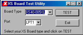 Place the jumpers in the default setting, connect the cable between the PC parallel port and the J1 connector, and power up the board. Go to the XSTOOLS/BIN folder and launch the GXSTEST program. This will open the XS Board test utility, shown in Figure 6. Select the proper board type (ex. XS40-005XL) and press the TEST button. A message will appear in the window indicating the status of the test. If the test is successful, the LED on the board will display a 0, otherwise an E will be displayed to indicate an error. If an error occurs, check the parallel port connection and verify that the jumpers are in the proper location.