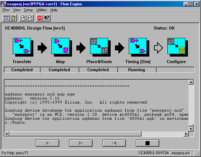 Figure 3: Flow Engine window for a FPGA target device (Screen clip from Xilinx (TM) Foundation software)