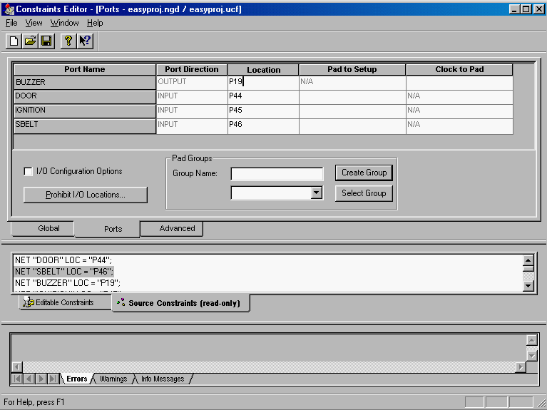 Be careful - the constraint file is case sensitive. Make sure you use exactly the same name in the constraint file as the one you have defined in your schematic or in the HDL file. The "#" is used for comments. When done, save the file. You can now re-run the implementation tools by selecting the version in the left window pane (versions tab) of the Project Manager. Click on the version with the right mouse button and select "Invoke Interactive Flow Engine". Start the Flow Engine. When finished successful, check the Pad or Fitting report to make sure that the right pin locations have been assigned.NET "BUZZER" LOC = "P19"; # output: DOORNET "DOOR" LOC = "P44"; # inputNET "IGNITION" LOC = "P45"; # inputNET "SBELT" LOC = "P46"; # input