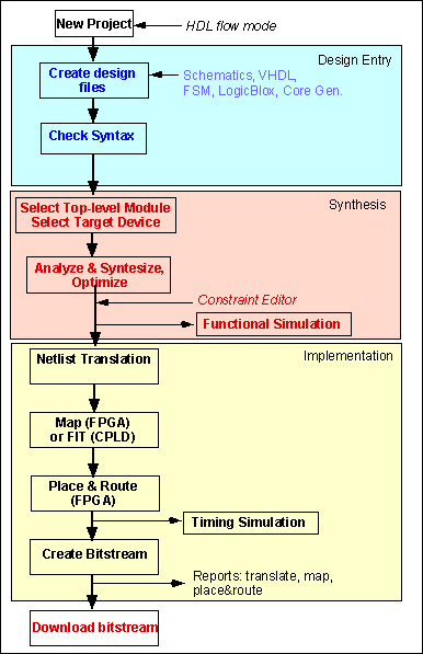 Figure 3: Overview of the design and implementation sequence of a HDL Flow project. [2].