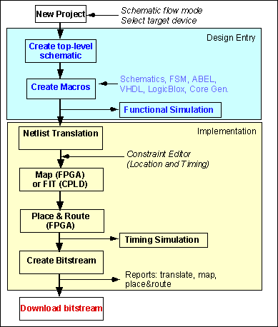 The schematic flow mode allows you to create a design that consists of either a top-level schematic or top-level ABEL file. It can contain underlying schematic diagrams, state machine macros, instantiated HDL (ABEL, VHDL or Verilog) macros, LogiBLOX, CORE Generator modules.