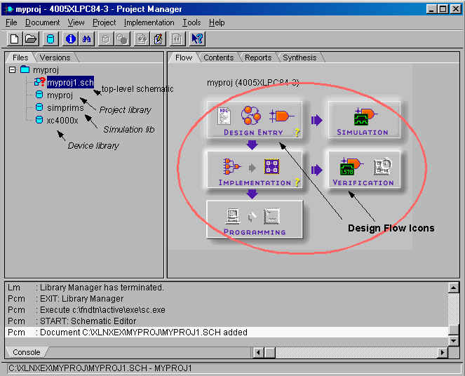 When you create a new project e.g. MyProj, the Foundation tools will create the following files: a project configuration file (PDF), called Project Description File (myproj.pdf), and three library files, the project library file (myproj), the simulation library file (simprims) and the device library (xc4000x) files. The libraries are shown in the left window pane (called the Hierarchy browser) of the Project Manager. A project must always have one or more top level design files. In case the top-level cell is a schematic, the file will be shown in the hierarchy browser with an extension .sch (e.g. myproj.sch) as can be seen in Figure 4 above. The foundation tools will create additional folders and files during different stages of the project design/implementation.