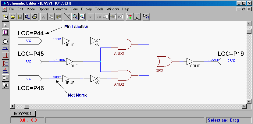 Nets (wires) should be user-defined for readability and documentation purposes. You can name a wire by clicking on the "Name Wire Icon" just below "bus" icon on the vertical toolbar. Type in a name in the Net Name window and put the cursor over the location of the wire. Make sure you point to the wire that you want to name, otherwise the name will not be connected to anything. A shortcut to naming nets is double clicking on the net. You can now fill out the net name between the pads and buffers for the three inputs (DOOR, IGNITION AND SBELT) and the output (BUZZER). Net names should appear in blue (green names indicate that the name is not connected to a net).
