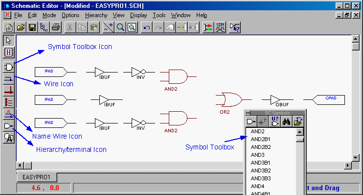 Go to the FILE menu -> SAVE or click the floppy disk icon on the top toolbar. Give your schematic a name with the extension .SCH (ex. EASYPROJ.sch). When finished with the schematic, exit the Schematic capture program which will bring you back to the Foundation Program Manager window (Figure 3.3).