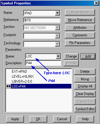 Figure 6: Symbol Properties window to assign pin locations (Screen clip from Xilinx (TM) software window)An alternative way is to not assign pins on the schematic, but specify the pin numbers later, before compiling the design. This can done by creating a User Constraint File (see constraint editor section). The advantage of the latter method is that the schematic is more generic and you can easily change pins without having to modify the schematic (or the HDL code).